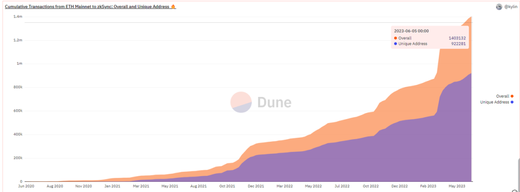 同样基于链上数据, 2023.5.8-6.7 Syncswap的月活跃地址数为843692,6.1-6.7的周活跃地址数为247814,而截至6.5日zkSync的独立地址数为92.2万,这也意味着近91.4%的地址在一个月与Syncswap有过交互。