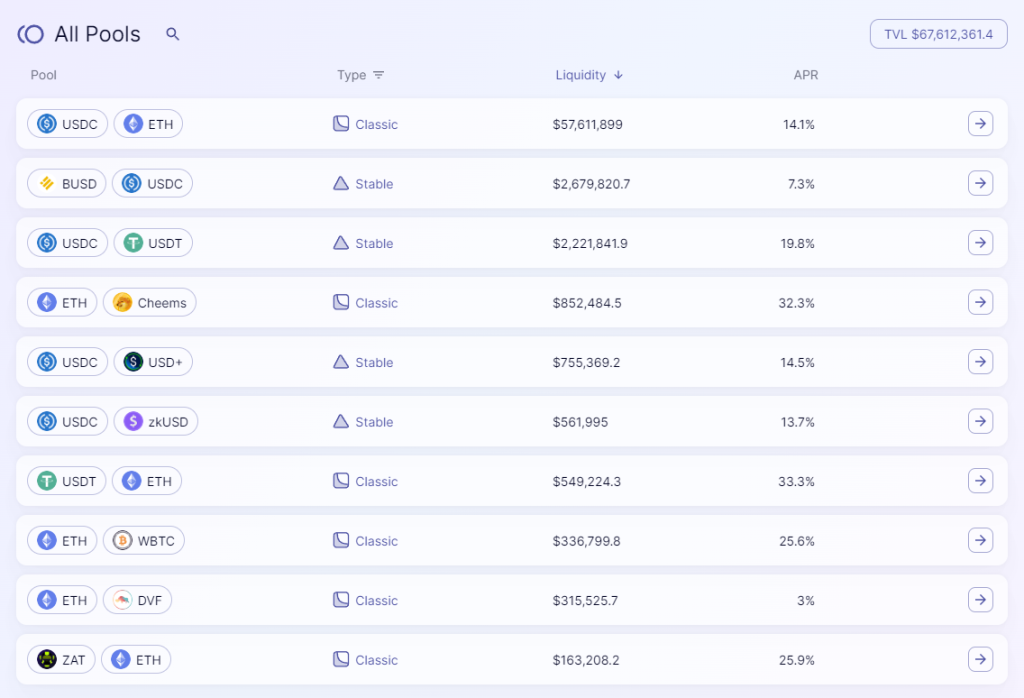 Syncswap的流动性总量为6761万$,其中ETH-USDC Pool就占到了5761万美金,占比84.5%。