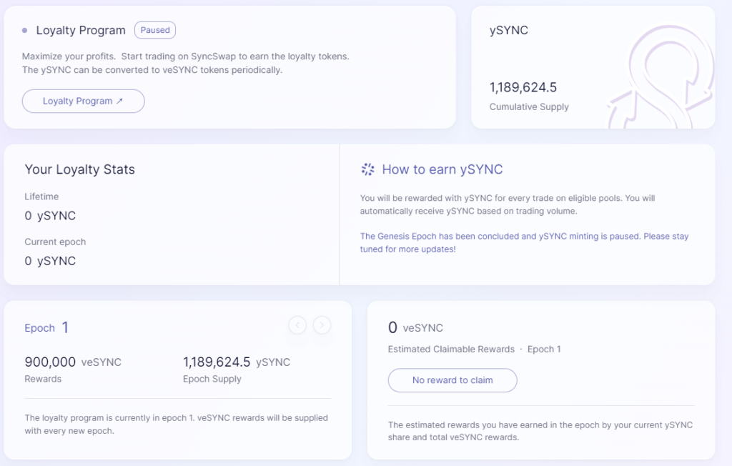 忠诚计划的创世epoch为今年4月10日-5月10日,总奖励为90万veSYNC,最终参与用户获得的ySYNC为1,189,624.5,这意味着活动期间用户在指定交易对上共支付了1,189,624.5$的交易费,对应1veSYNC的获得成本≈1.32$。
