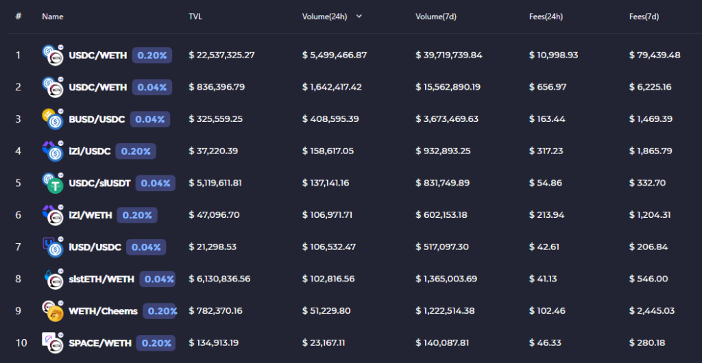 与Syncswap类似,iZiswap的ETH-USDC交易量占比更加极端,两个Pool的交易量占到了日总交易量的85.8%,其次是稳定币和自有代币IZI。