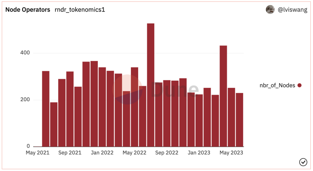 虽然赶不上一年五倍的币价涨幅,Render Network 的 GMV 确实迎来了较大的增长,2022 年 GMV(Gross Merchandise Value,成交总额)相比去年增加 70%。根据 Dune 看板的 $RNDR 分配给节点的总量,2023 年上半年 GMV 约为 $1.19 M,相比 2022 年同期基本没有涨幅。这样的 GMV 在 7 亿美元的 mCap 上显然不够看。