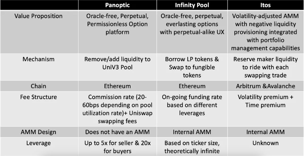 对于 Infinity Pool 来说,他们仍然需要与外部 AMM 进行交互才能成功平仓,导致相对较高的费用。另一方面,与其他两个协议相比,Itos 的定价可能更具竞争力,因为它们不需要与任何外部 AMM 进行交互,并且根据波动性调整交换费。话虽如此,这些协议的不同提供意味着它们可以吸引具有不同风险配置的用户:Infinity Pool 的理论上无限杠杆可能更适合永续期货交易者,而 Panoptics 和 Itos 可能更适合更复杂的零售交易者和需要直接在链上进行对冲的 DAO。