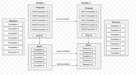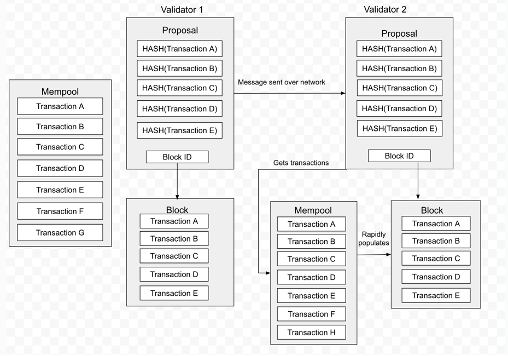 让所有的 mempool 都包含所有的交易是很理想的状态,在现实中很难达成。因此 Sei 做了补救措施。区块提议者在 propose 区块的时候会将区块打碎并发送给全网,同时发送一条区块内所有交易的 hash。其他验证者根据该 hash 在自己的 mempool 里寻找相应的交易,如果缺少一部分交易,则从区块提议者发送的区块碎片里寻找缺失的部分交易以实现区块重构。通过这种方式 Sei Network 缩减了其他验证者同步区块信息所需的时间。