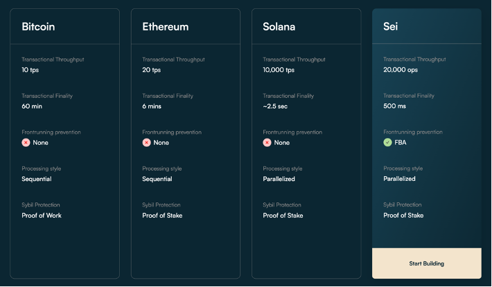 目前的 Layer1 呈现出百花齐放的状态,每个平台都有其独特的功能、优势和局限性。为了更好地了解 Sei 的优势,我们将 Sei 与 Sui、Aptos、Solana 和以太坊等知名平台进行比较分析。