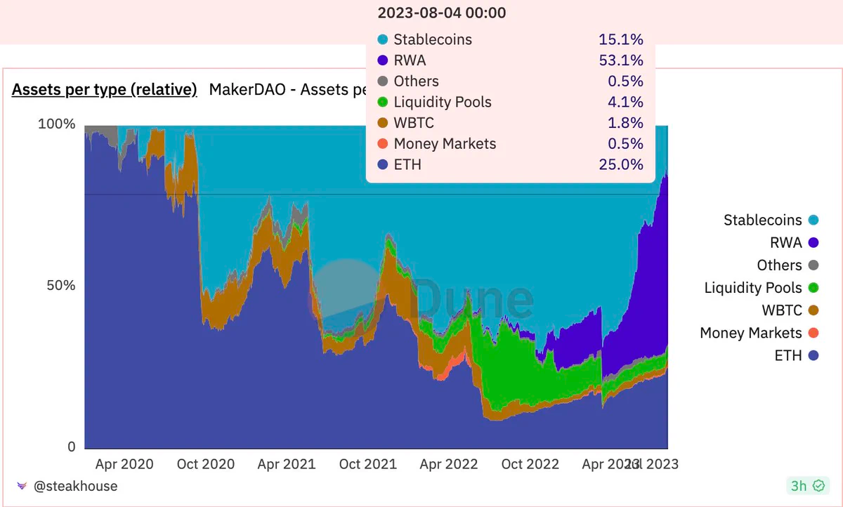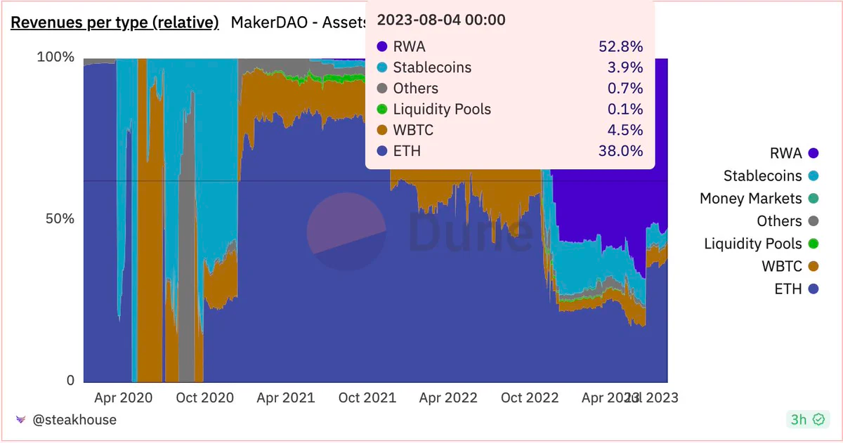 而引入大量RWA资产也为MakerDAO带来了大量的额外收益,我们可以通过Dune看到RWA资产的比例已经超过了整个MakerDAO协议资产负债表的一半。
