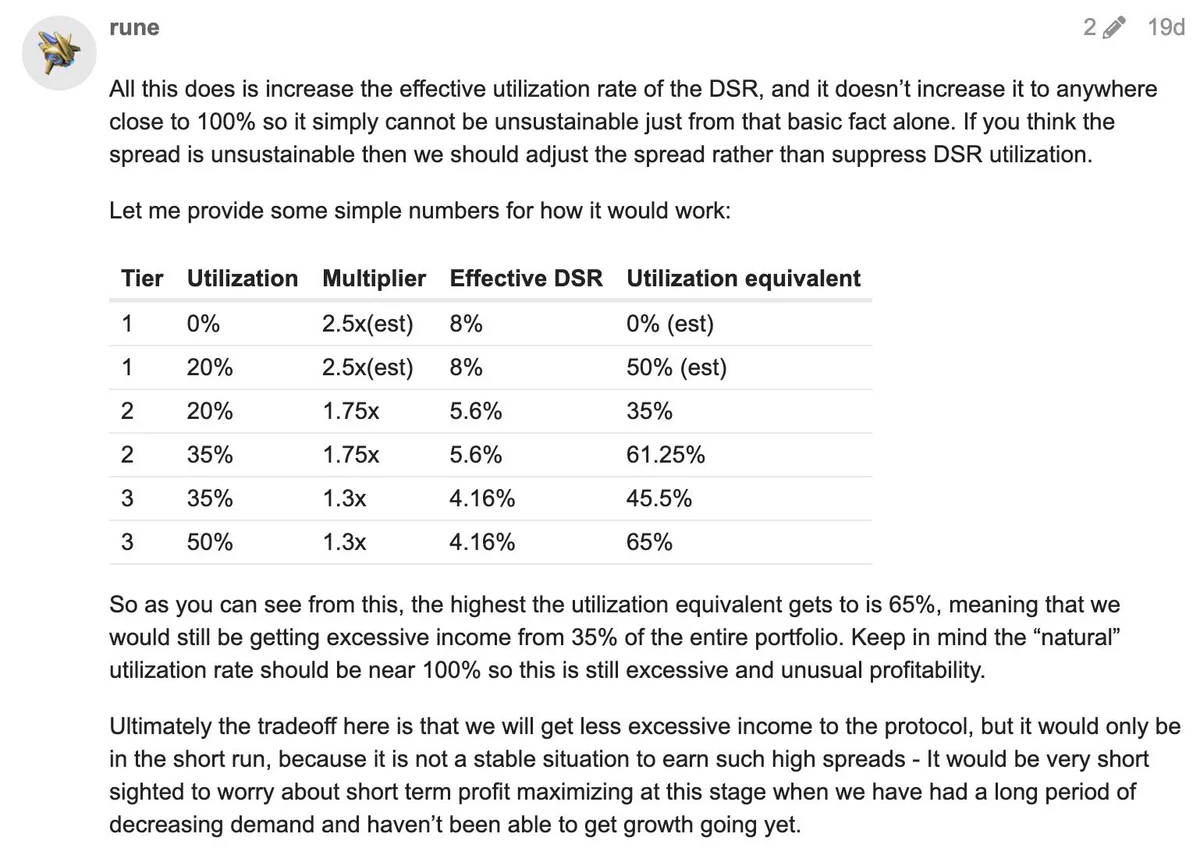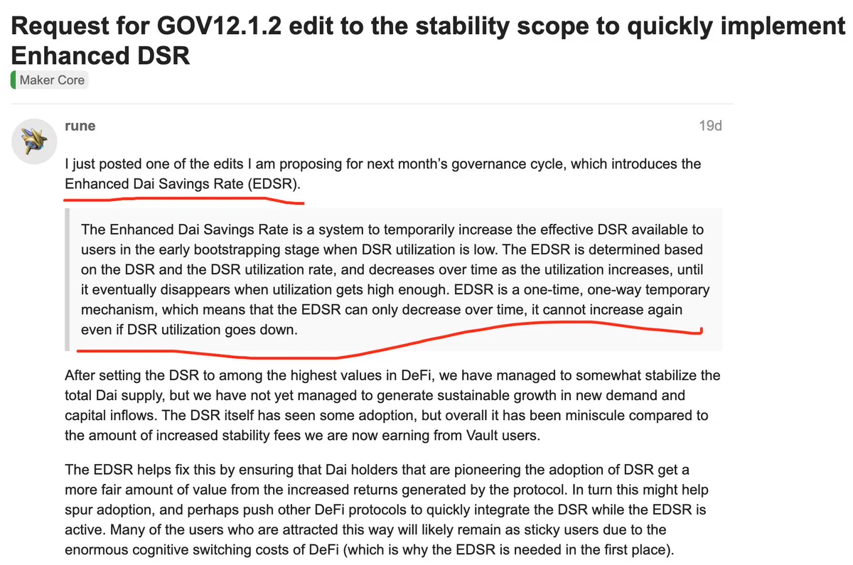 先说答案,不可持续,因为这次的8%利率其实是一个一次性的“促销活动”,我们可以看到在讨论提高DSR利率的讨论中Rune说到引入了一种新的机制:Enhanced Dai Savings Rate (EDSR),这是一种用于在DSR利用率较低的早期引导阶段临时提高用户可使用的有效DSR。