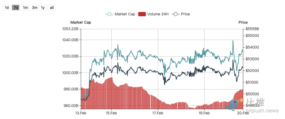 周二,比特币再次冲高回落,从盘中高点 53,019 美元跌至低点 50,812 美元,跌幅高达 4%,此后价格有所回升,截至发稿时交易价格为 52,330 美元,过去 24 小时内下跌 0.15%。过去一周,比特币的价格大致在 51,000 美元至 52,500 美元之间波动。