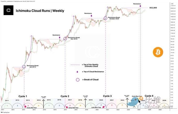 CryptoCon 在帖子中表示,「Ichimoku Could 两次标志着中顶、拒绝点和长横盘期。现在突破这一点将比平常早几乎一整年。」