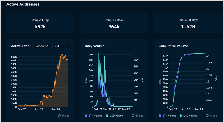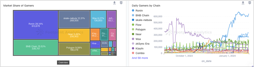 Pixels 之前在 Polygon 上运行,2023年移到了 Ronin网络。根据Nansen的数据显示 Ronin 的活跃用户大幅增加,从 11 月份的约 20,000 人增加到最新更新的 665,000 人,这其中有一大部分是来源于Pixels ,Pixels 也成为了继AxieInfinity之后Ronin 上的另一个龙头链游。