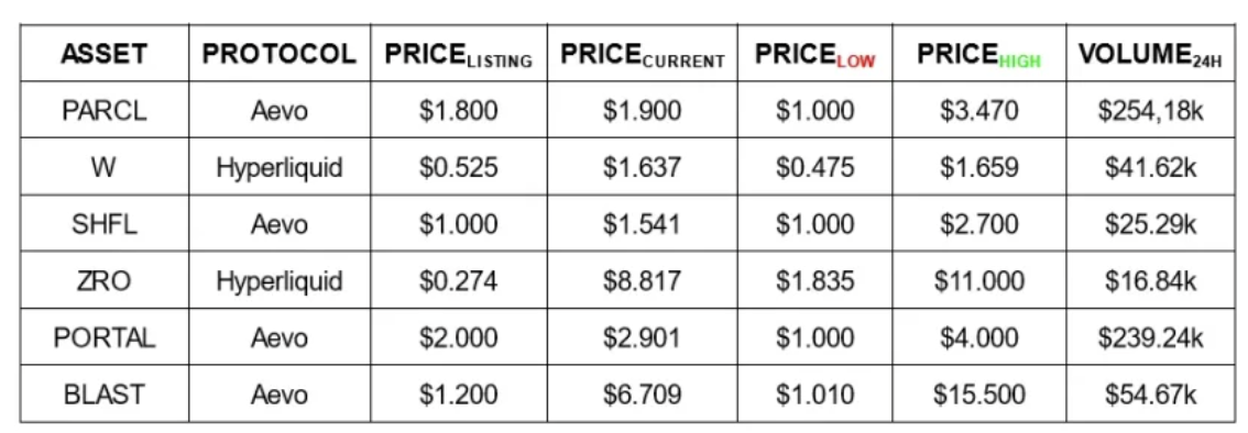 回顾了历史数据,让我们看看当前的机会。截至今天,有大量未发行的代币可在 Aevo 和 Hyperliquid 上进行交易。