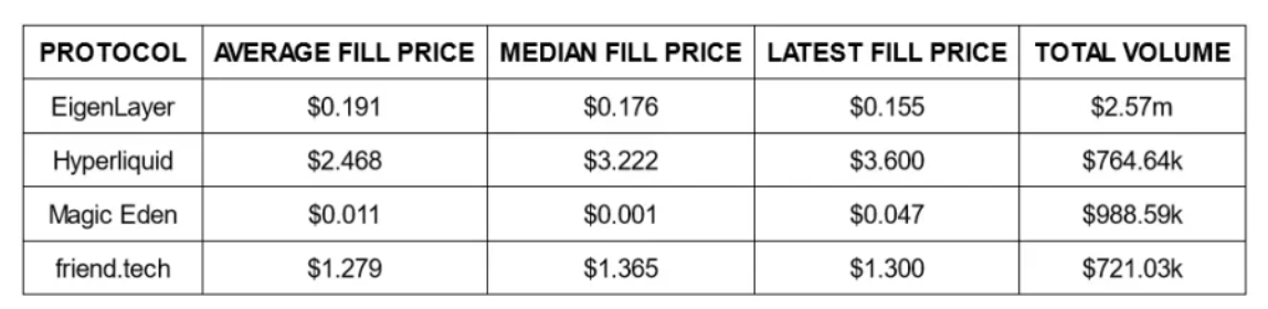目前有 9 个协议可以在平台上进行积分交易:Parcl 、Kamino 、Ethena 、Magic Eden 、Hyperliquid 、EigenLayer 、friend.tech 和 ether.fi 。在不久的将来,Marginfi 、Drift 和 Blast 应该也会上线。