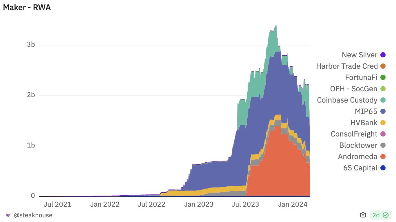 根据 Dune 数据显示,Maker 在 RWA 板块的投入金额已超 17.7 亿美元。但由于 RWA 的产品特性,抵押的加密资产每日赎回存在一定限制,一旦 DAI 供应量持续减少或引发流动性紧缩风险。与此同时,MakerEndgame 数据显示,针对 DAI 流动性推出的 PSM(锚定稳定模块)的稳定币储备也已将至超 7.9 亿美元。
