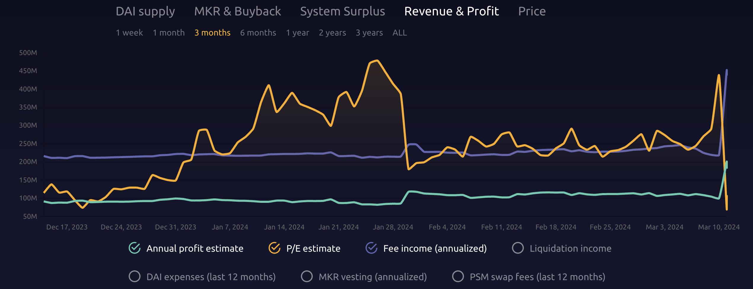 为应对市场进一步波动和看涨情绪导致的潜在过度 DAI 需求冲击,BA Labs 提出了费用调整提案,并在当天获得投票通过后,已在 3 月 11 日凌晨正式实施。根据该提案显示,关键改动包括将 DAI 的储蓄率从原本的 5% 提升至 15%,以及对其核心金库实施稳定费调整,预计增加约 9-10%。