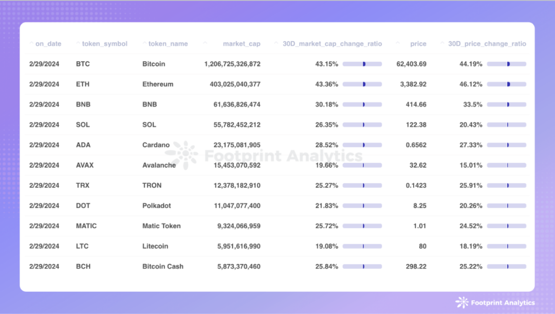 二月份,加密货币市场展现出强劲的上涨势头,这主要得益于比特币和以太坊的价值大幅上涨超过 45%。这一乐观态势也影响到其他代币,前十大代币的价值均实现了超过 25% 的增长。