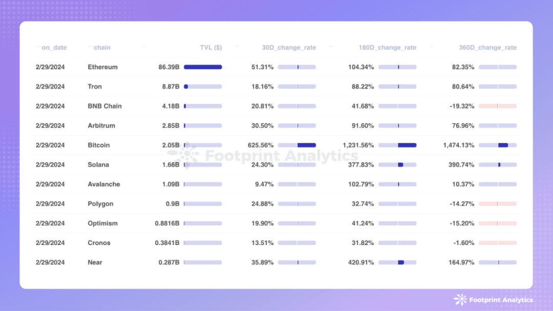 在 TVL 方面,公链行业在二月份结束时达到了 977 亿美元。其中,比特币的 TVL 飙升至 20.5 亿美元,相比一月增长了 600%。这一显著增长主要得益于比特币 Layer 2 技术的进展以及质押活动的蓬勃发展,特别是 Merlin's Seal 项目表现尤为突出。