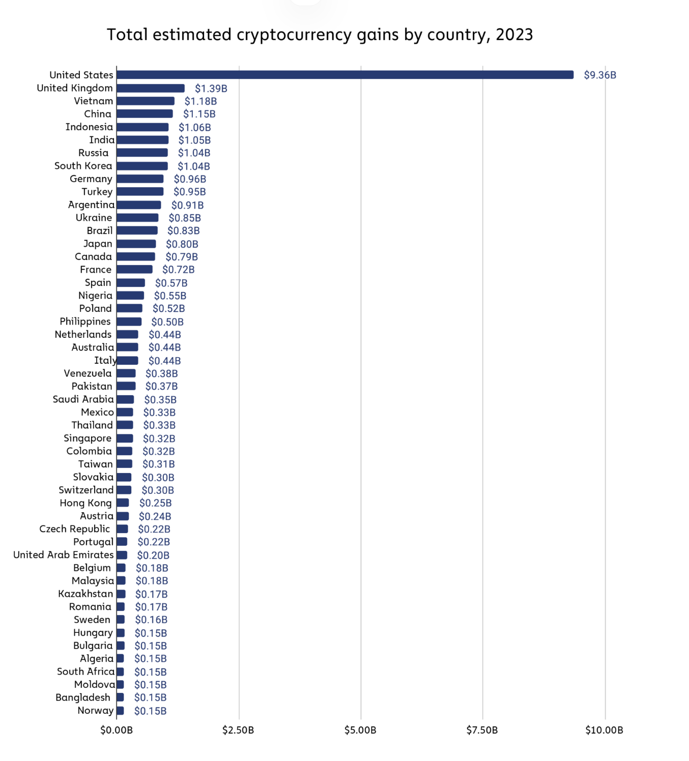 2023 年,美国在加密货币收益方面遥遥领先,估计达到 93.6 亿美元。英国位居第二,加密货币收益约为 13.9 亿美元。