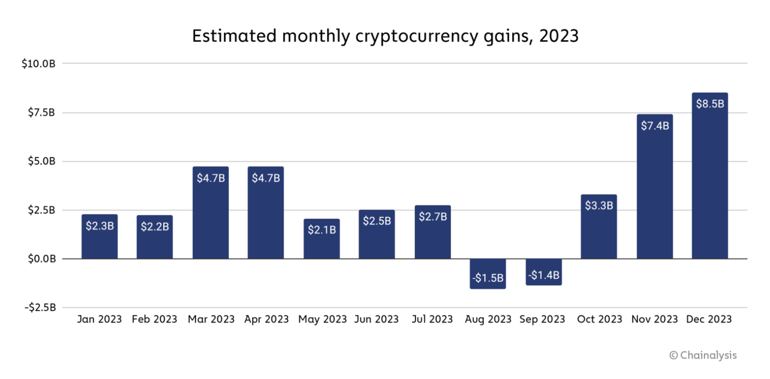 总体而言,我们估计所有加密货币投资者在 2023 年的总收益为 376 亿美元。