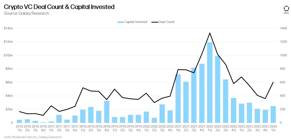 2024 年第一季度,风险投资者向加密货币市场和区块链公司投资了 24.9 亿美元(环比增长 29%),涉及 603 笔交易(环比增长 68%)。