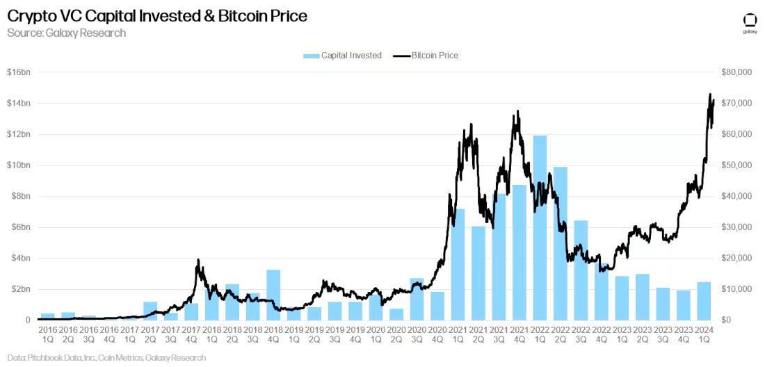 虽然加密货币领域的风险投资通常与比特币价格相关,但在过去一年中,这种相关性已被打破,比特币自 2023 年 1 月以来大幅上涨,但风险投资活动却大多萎靡不振。2024 年第一季度,比特币大幅上涨,虽然投资资金也有所上升,但投资活动仍远未达到比特币上次交易价格超过 60,000美元时的水平。加密货币行业原生催化剂(比特币 ETF、再质押、模块化、比特币L2等新领域)和宏观逆风(利率)共同造成了显著的分歧。