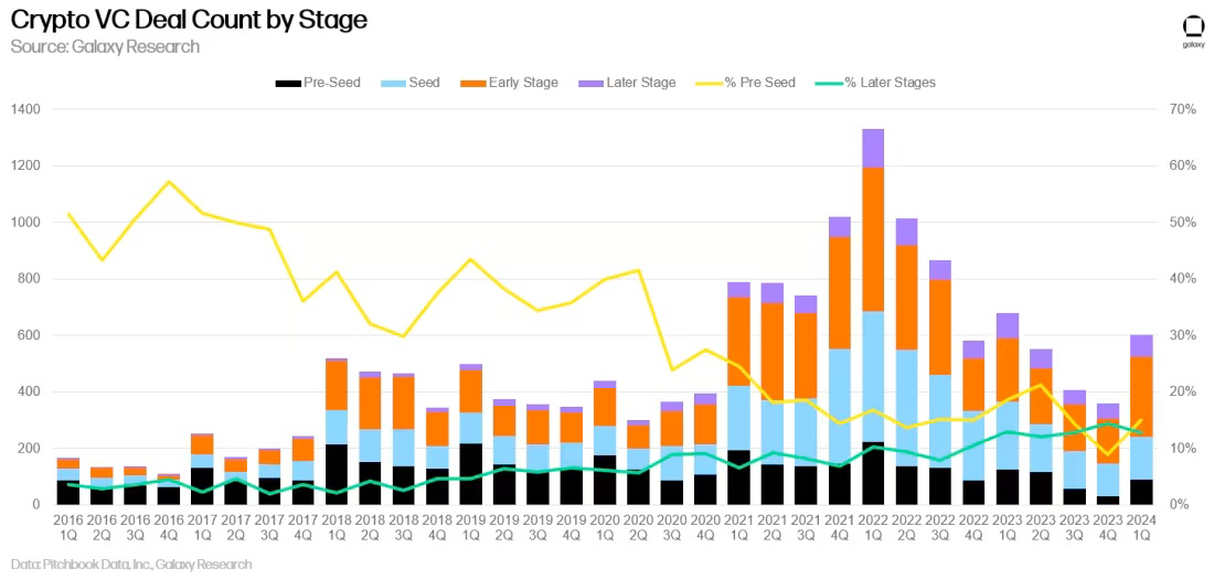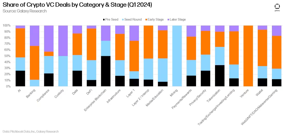 早期交易在第一季度独领风骚。对早期交易的持续关注预示着更广泛的加密货币生态系统的长期健康发展。虽然后期阶段的公司一直在努力筹集资金,但创业者们正在为新的、创新的想法找到愿意投资的投资者。这些项目和公司正在人工智能和加密货币的交叉点上构建扩展解决方案、游戏、工具和服务。