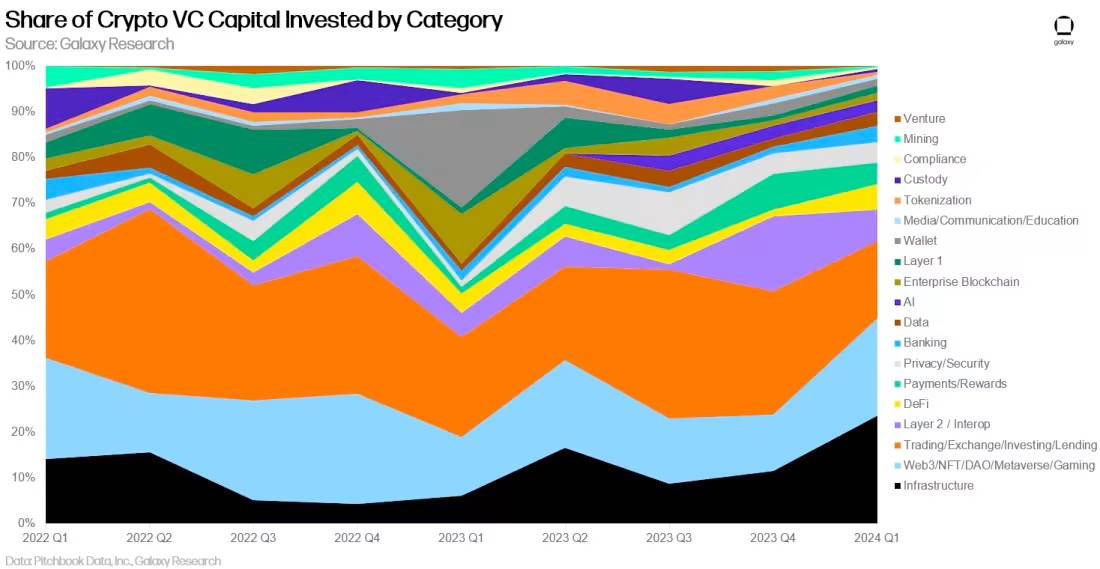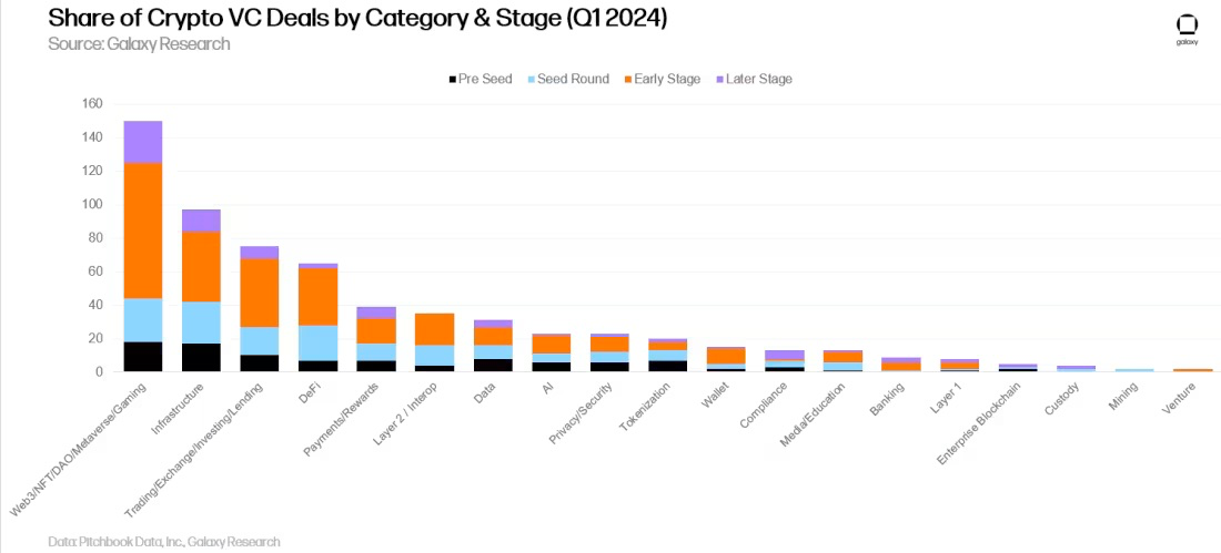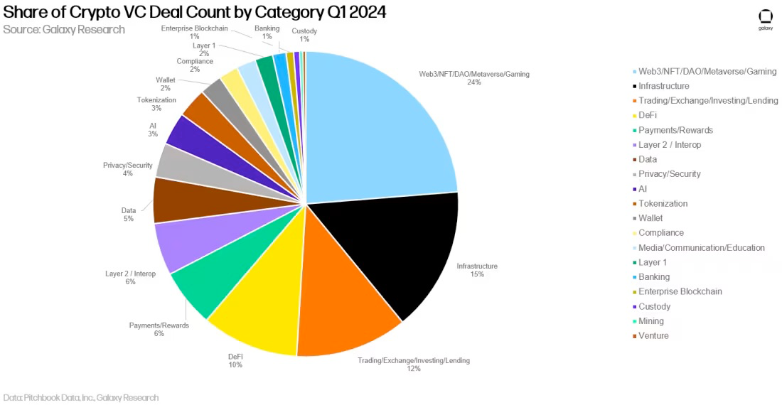 Infrastructure和Trading紧随其后,分别占 2024 年第一季度完成的所有交易的 15% 和 12%。