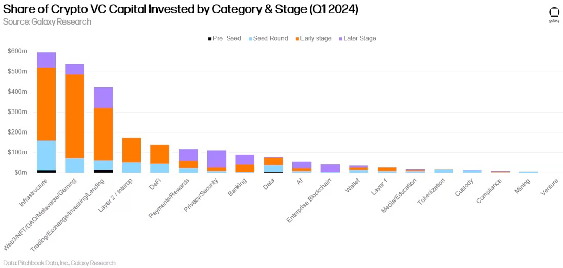 2024 年第一季度,“Infrastructure”类别的公司和项目筹集到的加密风险投资占比最大(24%),以EigenLayer 1 亿美元的融资为首。