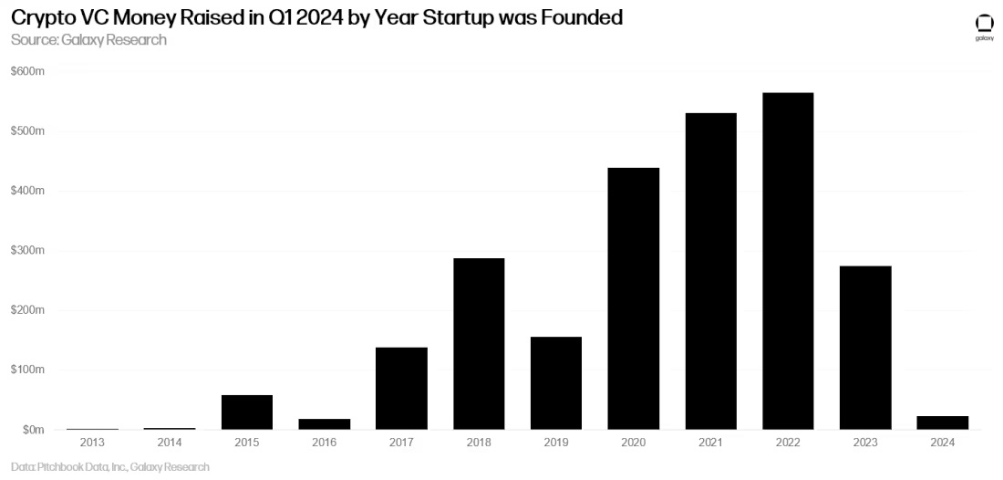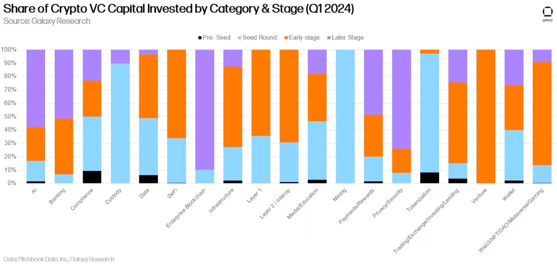 2024年第一季度,约80%的资金流向了早期的公司,而20%流向了后期创立的公司。由于以加密货币为重点的早期风险基金仍然活跃,而且许多基金仍在 2021 年和 2022 年依靠自己的筹款来维持生机,因此引人注目的早期公司仍然能够获得资金。但许多大型综合风险投资公司已经退出了该行业,或者大幅减少了风险敞口,这使得后期创业公司更难融资。