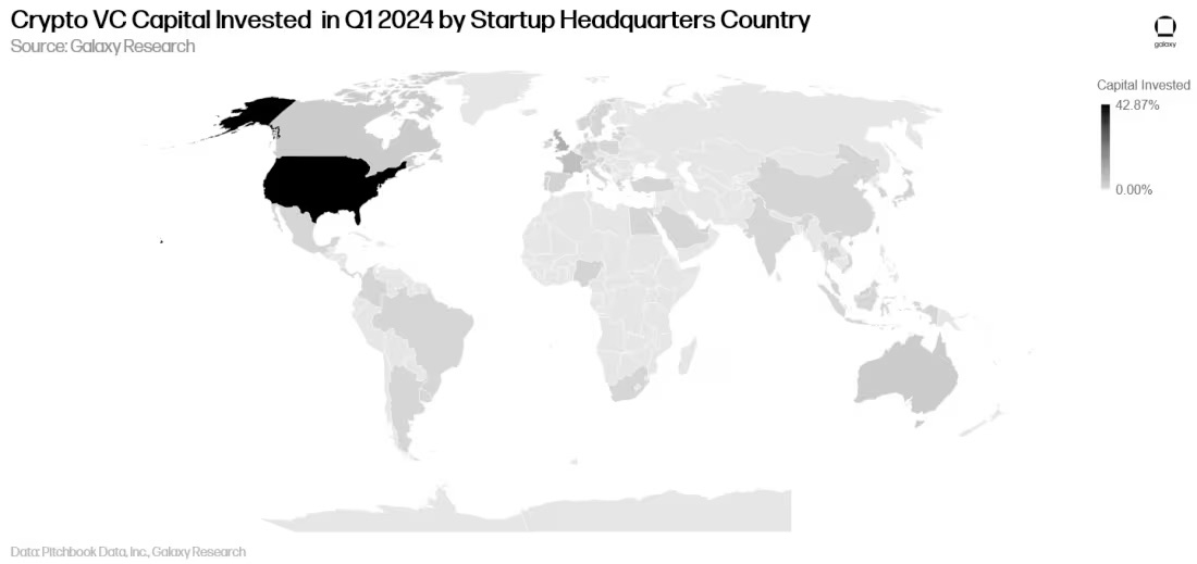 尽管监管环境很棘手,但总部设在美国的公司继续完成最多的融资交易,并从风险投资者那里筹集到最多的资金。在 2024 年第一季度,超过 37.3% 的交易涉及总部位于美国的公司。新加坡为10.8%,英国为10.2%,瑞士为3.5%,香港为3.2%。