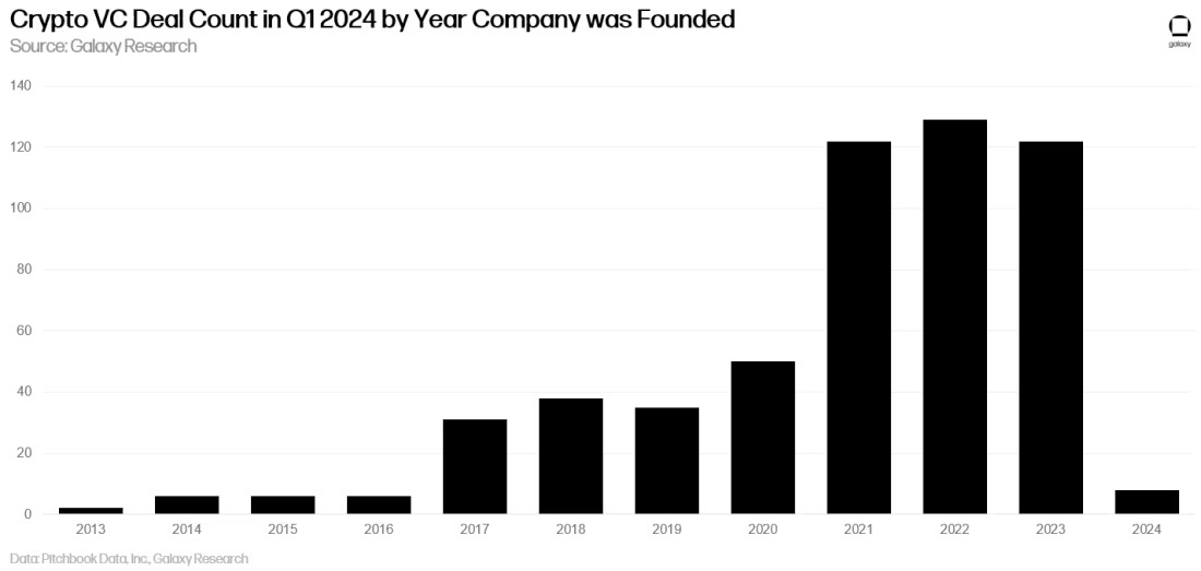 在 2024 年第一季度完成的交易中,绝大多数都涉及成立于 2021-2023 年的初创企业,鉴于 2024 年才刚刚开始,这也在情理之中。