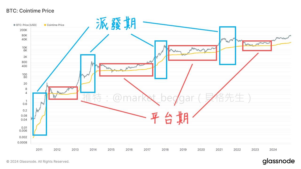 我们可以看到,每次牛市主升浪出现时,必然伴随 Cointime Price 的高派发率。