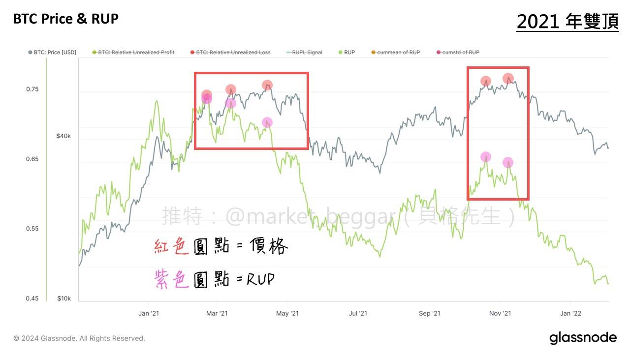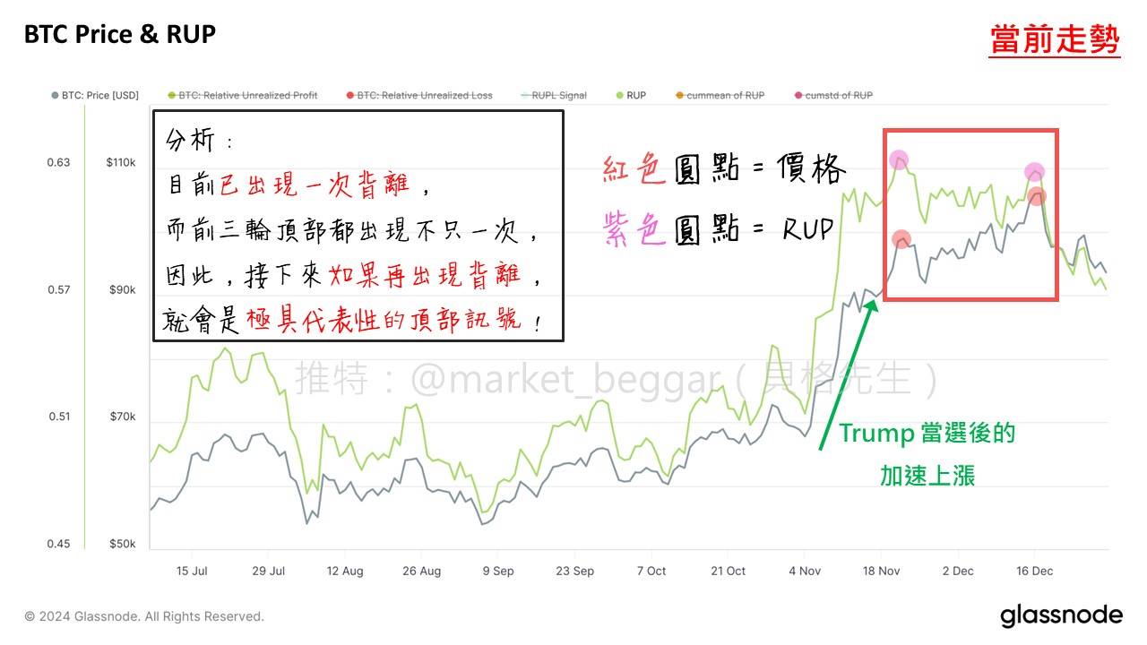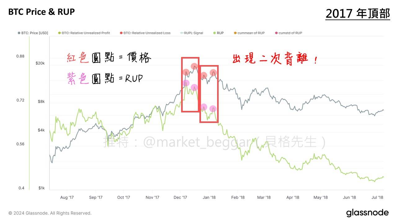 “当 RUP 走势与 BTC 价格走势出现背离时,高机率意味着顶部的出现”