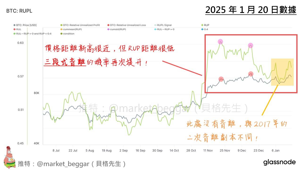 随后,在 2025 年 1 月 20 日,RUP 再次出现了与 2013 年、2021 年第一顶同款的三段式背离,当天的 BTC 收盘价约为 106,000。