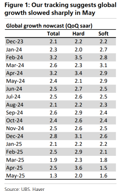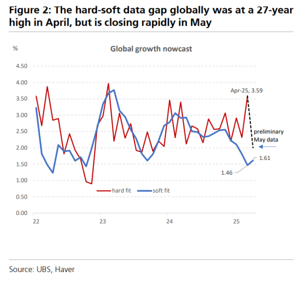 瑞银表示,4 月份,在关税公告发布后,全球硬数据和软数据出现急剧分化(达到 27 年来的最高差距),硬数据显示年化增长 3.6%,而软数据仅显示 1.3%。但 5 月份开始趋同,因为硬数据恶化的速度快于软数据改善的速度。