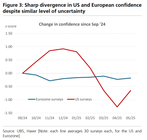值得注意的是,美国信心指数下跌幅度超过其他地区,而欧洲调查数据基本持平,尽管两地面临相似的政策不确定性水平。在美国,调查数据已比 12 月水平低 1.5 个标准差。