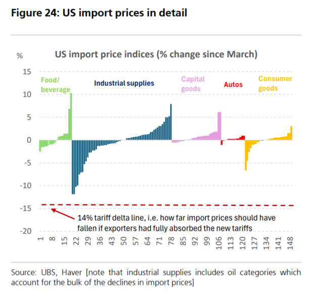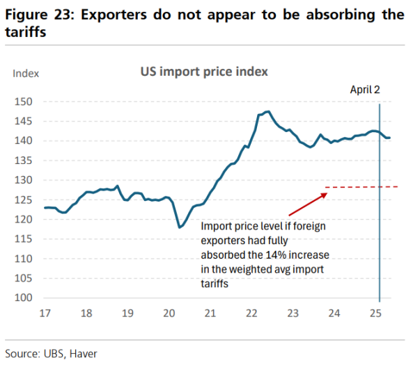 瑞银认为,外国出口商可能确实吸收了美元贬值对其利润的影响,美国进口商承担了主要关税成本。目前,也没有看到转运的明确迹象,但现在还为时尚早。