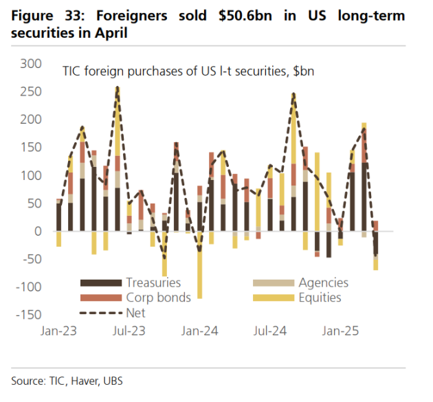 瑞银表示,4 月份美国 TIC 数据提供了抛售美国资产的证据,但尚不清楚这种轮动是否持续到 4 月之后。数据显示外国投资者净卖出 506 亿美元美国长期证券,包括 188 亿美元股票和 408 亿美元国债。