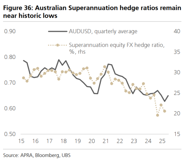瑞银认为,美元持续贬值可能反映了全球投资者提高了对美国资产的外汇对冲比率。澳大利亚养老基金和加拿大养老基金的外汇对冲数据显示,当前对冲比率仍处于历史低位,有进一步上升空间。