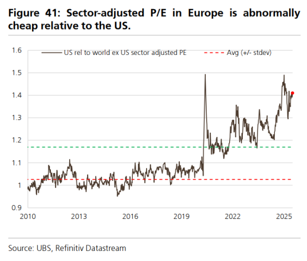 美国股市相对欧洲的板块调整后市盈率比欧洲高 25%,而历史均值仅为 7%。