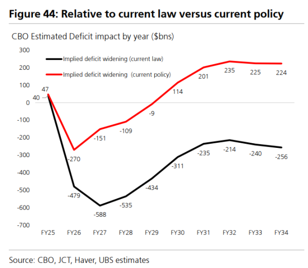 瑞银表示,该法案在 2026 年前增加赤字,之后转为收窄,10 年内总计减少赤字 4000 亿美元。