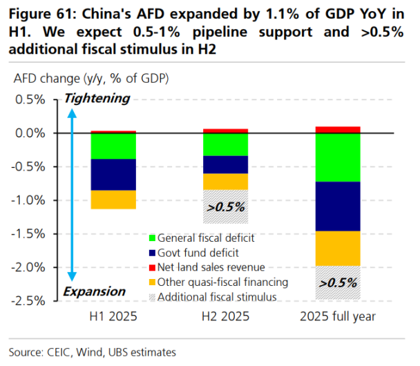 瑞银估计中国上半年广义财政赤字同比扩大至占 GDP 的 1.1%。预计下半年将交付其余计划财政刺激(0.5-1%GDP),并可能推出超过 0.5%GDP 的额外财政刺激,时点可能在三季度末。