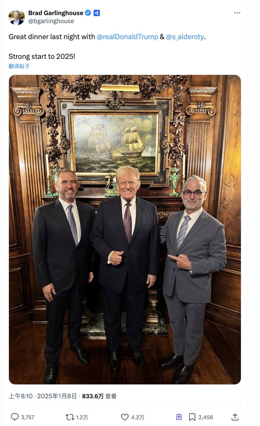 2025 年 1 月,Ripple CEO Brad Garlinghouse 受邀参加佛州度假村 Mar‑a‑Lago 的特朗普晚宴,并在推特上发布“Strong start to 2025!”的晚宴合照。