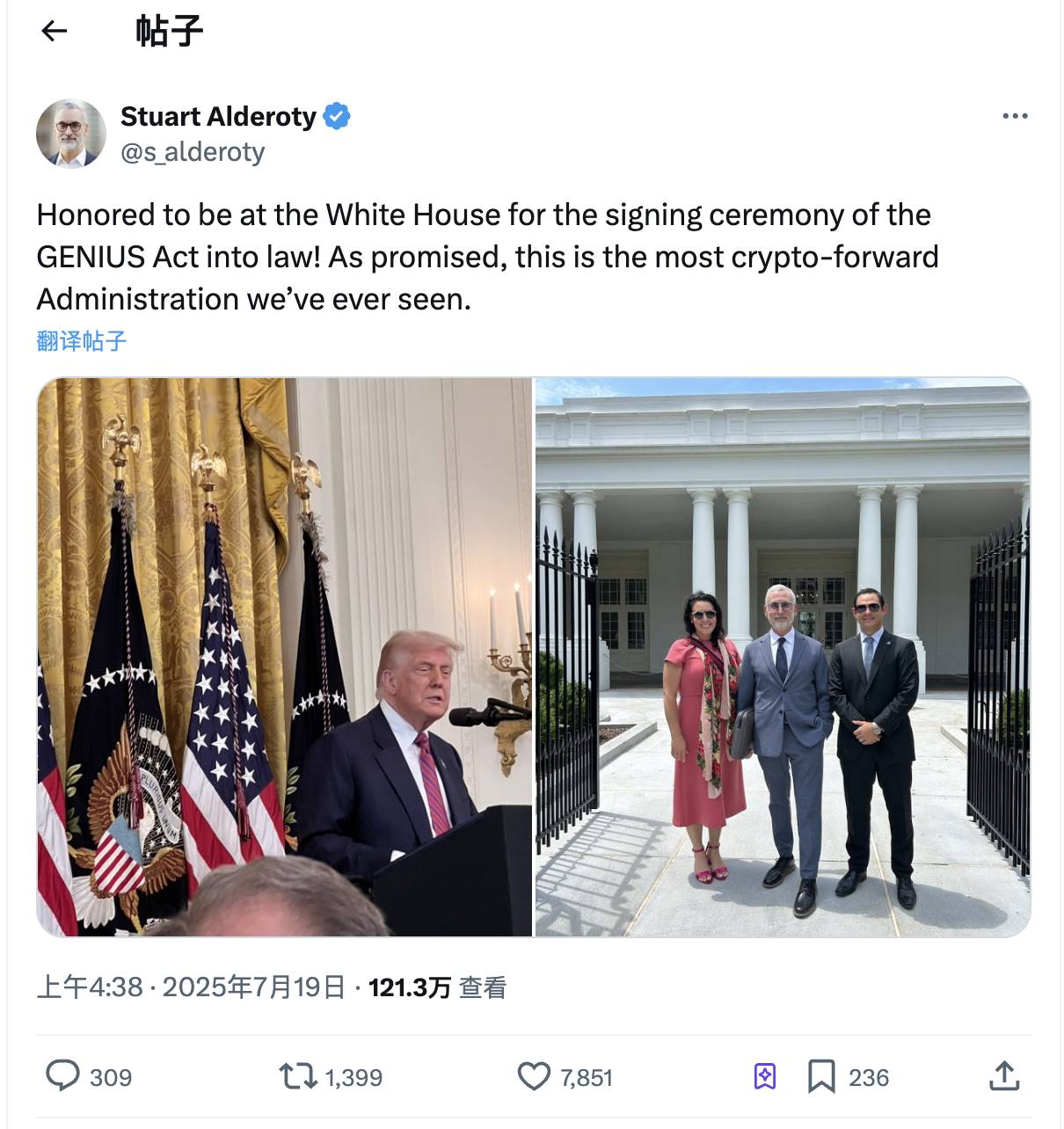 7月19日,特朗普在白宫正式签署《天才法案》,Ripple 首席法务官 Stuart Alderoty 被邀请至现场,是少数几个加密货币行业见证者之一。