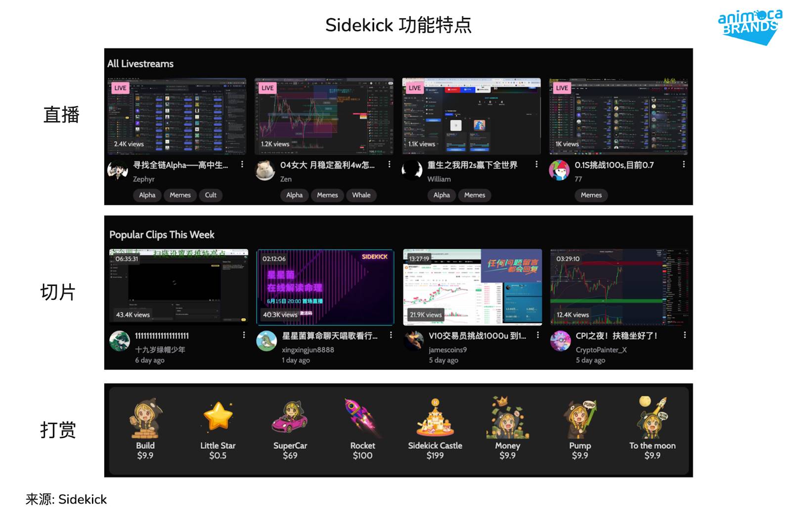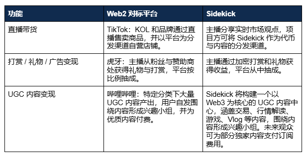 Sidekick 构建的“信任-行动”闭环源于产品设计:既吸收了 Web2 平台的互动机制,又具备 Web3 的交易能力。它融合了 TikTok、虎牙与哔哩哔哩的核心功能: