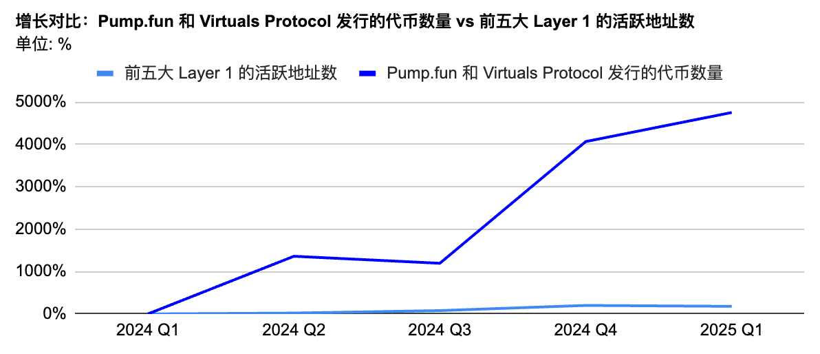 自 2024 年 Q1 起,随着 Pump.fun、BONK 的 LetsBonk 和 Raydium Launchpad 等工具和平台的出现,发行代币的门槛大幅降低。AI 驱动的智能代币进一步加速了这一趋势。代币发行量已较 2024 年 Q1 增长超 50 倍,而主流 Layer1 的活跃钱包数量也翻了一番。但代币的曝光机制未能同步扩展,导致早期项目难以获得关注。