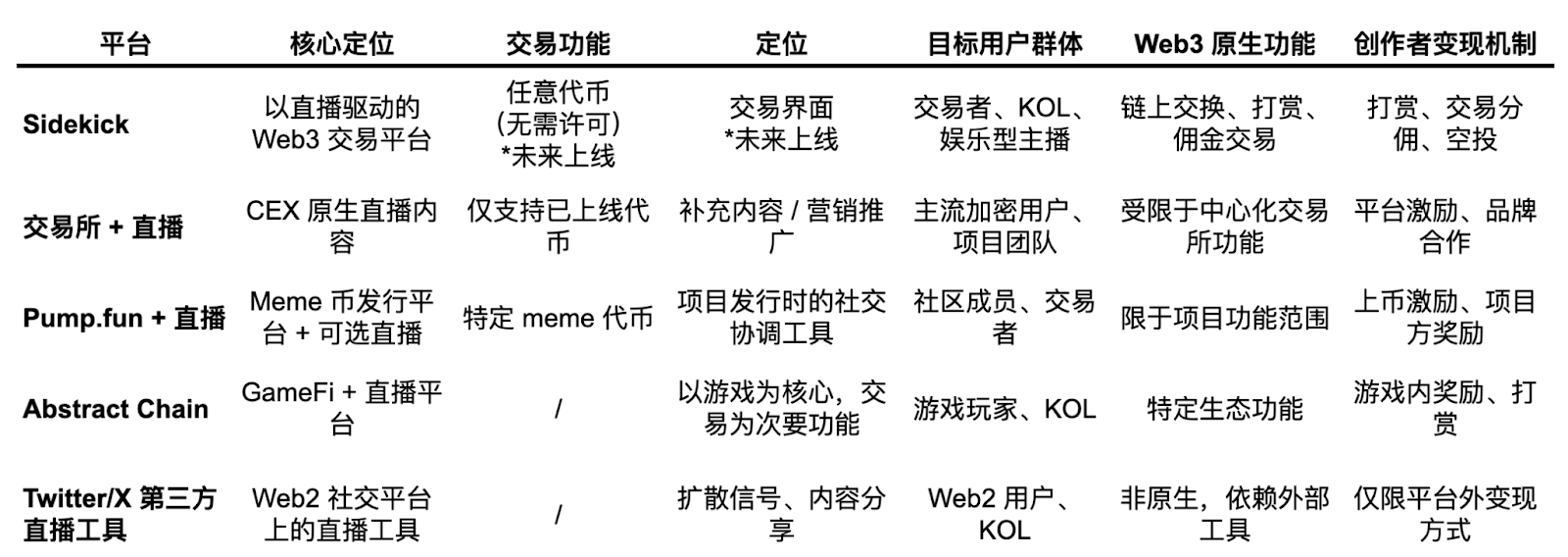 - Pump.fun 的直播功能定位于 meme 币发行如何通过直播制造病毒式流动性。直播更多是一种配合传播的手段;