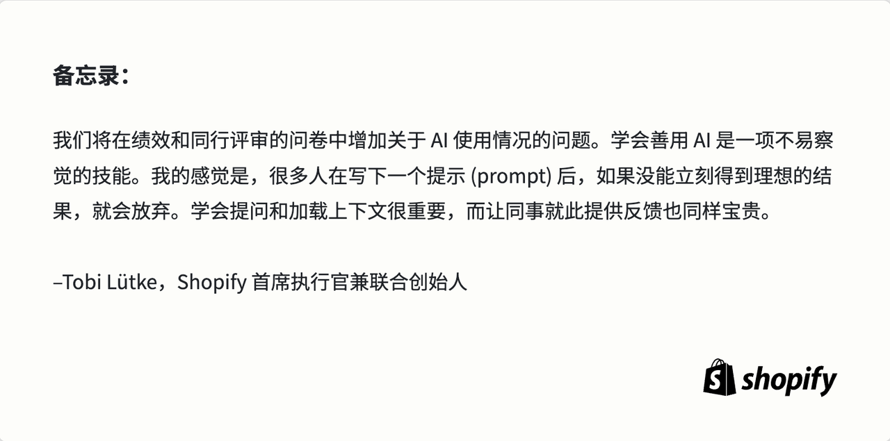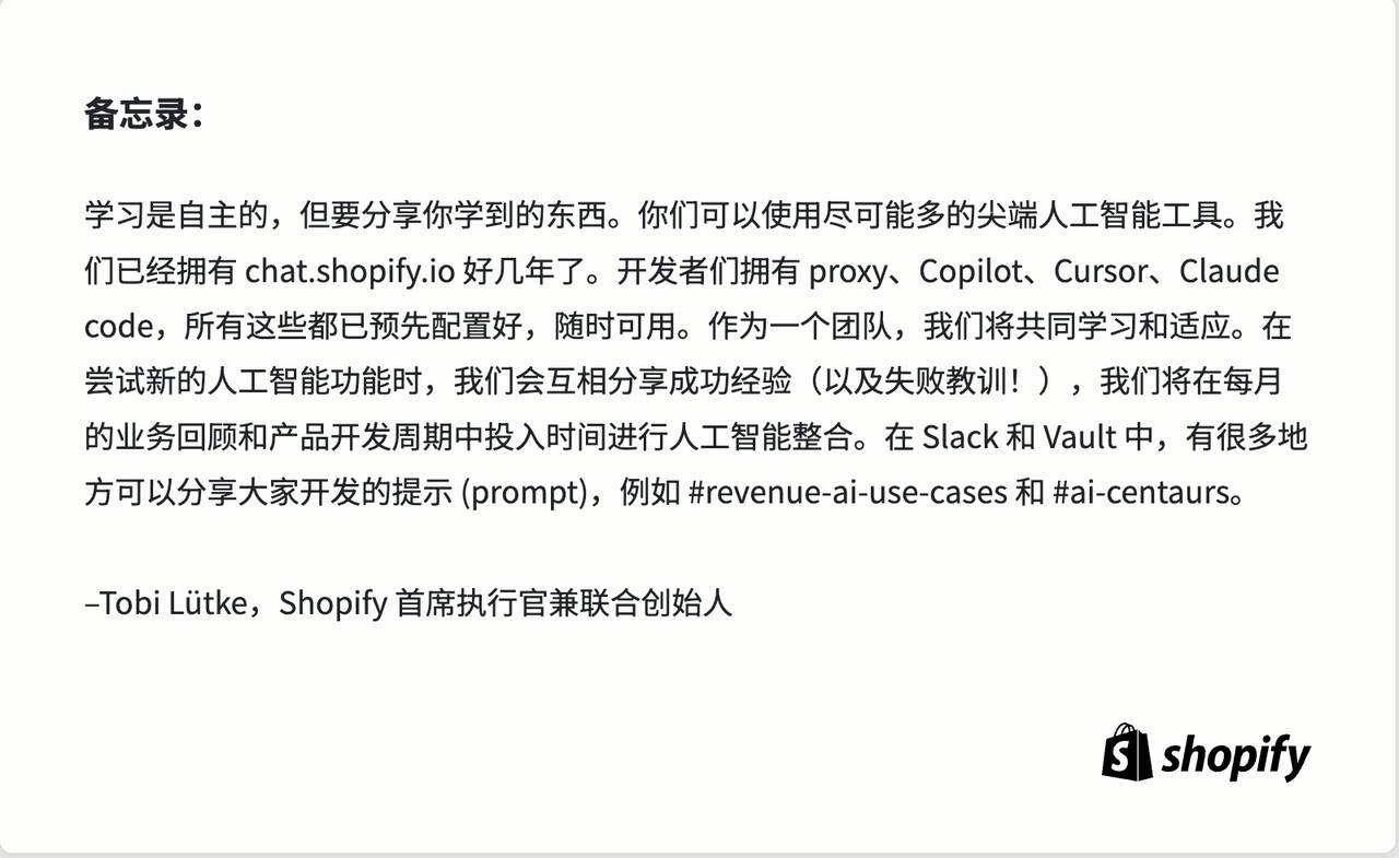 可以说,在 AI 如何在公司落地这件事上,从战略指导到技术落地,Shopify 给了一个很好的示范。