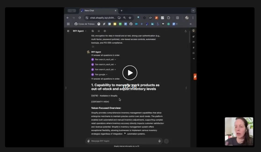 为此,Shopify 的营收工具团队开发了一款 agent,能够一次性回答多个 RFP 问题。这款 agent 基于 LibreChat(Shopify 是其核心贡献者之一)构建,它能调用内部的知识库,包括公开文档、帮助中心、案例研究等,自动生成内容丰富且有据可查的回复,极大地解放了方案工程师的生产力。