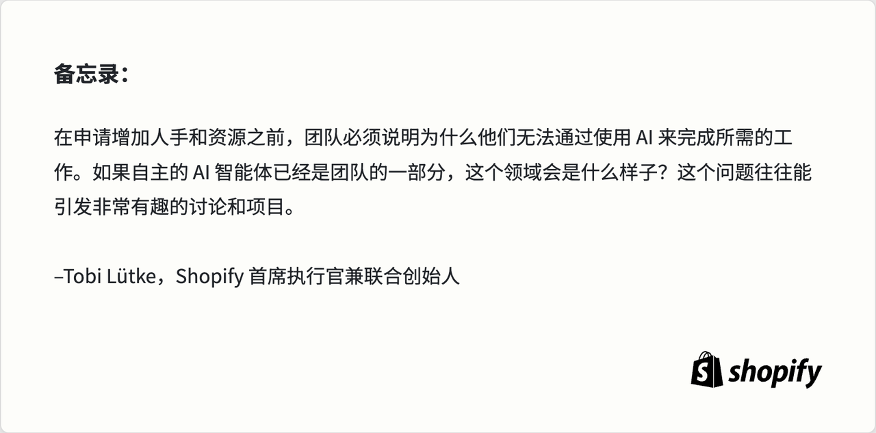 在人才策略上,Shopify 有意转变了思路,没有停留在「AI 将取代人力」这种简单的表面理解上,而是建立了一条新原则:「如果你能利用 AI 创造出卓越价值,公司就会投入更多资源来支持你」,而这些资源其中就包括新的人手。