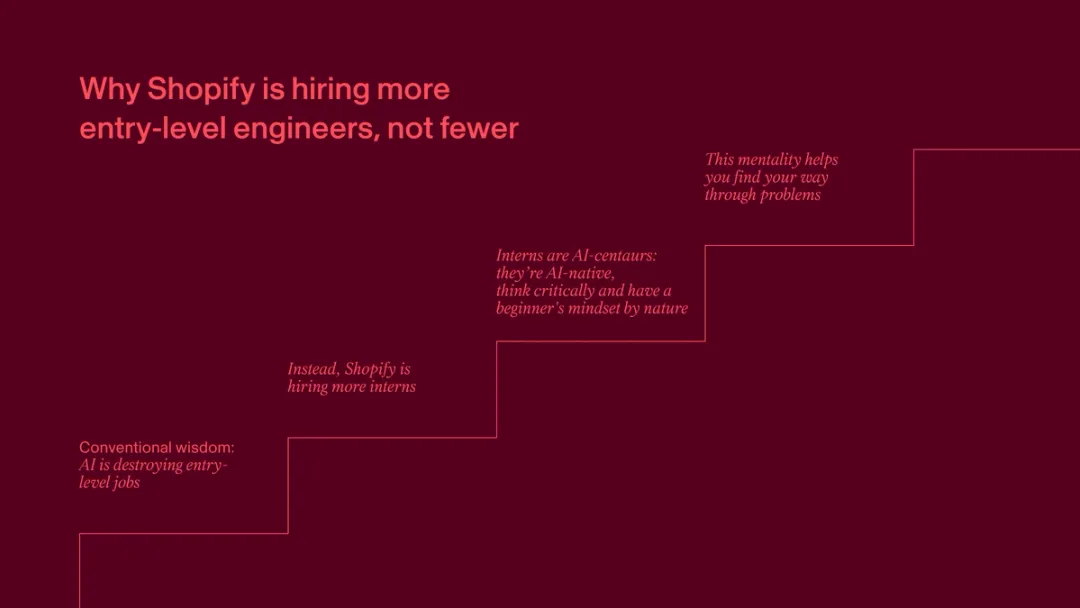 传统观点认为,AI 将会摧毁入门级岗位,工程专业的毕业生普遍有种「末日将至」的感觉,担心毕业即失业。但 Shopify 相反,雇佣了更多的实习生。因为他们发现,这些年轻人恰恰是以最富创造力的方式使用 AI 的群体,他们天生就具备初学者心态。