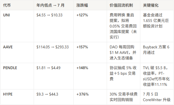 然而,Uniswap(UNI)、Aave(AAVE)、Pendle(PENDLE)、Hyperliquid(HYPE)等「实用型代币」却吸引资金逆流而上,价格与链上收入双双抬升。